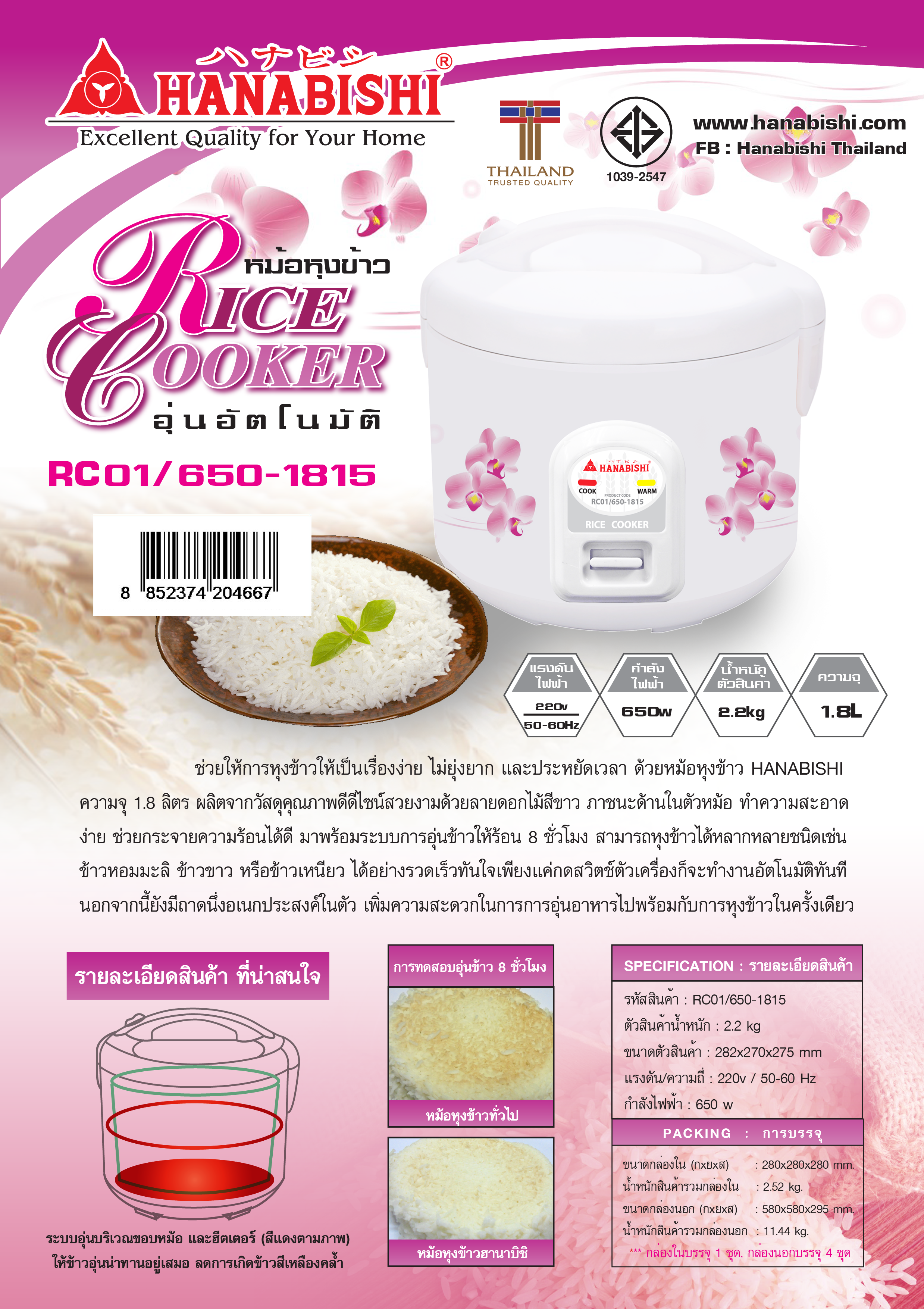 อุปกรณ์เสริมภายในกล่อง : ชั้นนึ่ง,ทัพพีตักข้าว,ถ้วยตวงข้าว,ใบรับประกัน,คู่มือการใช้งาน