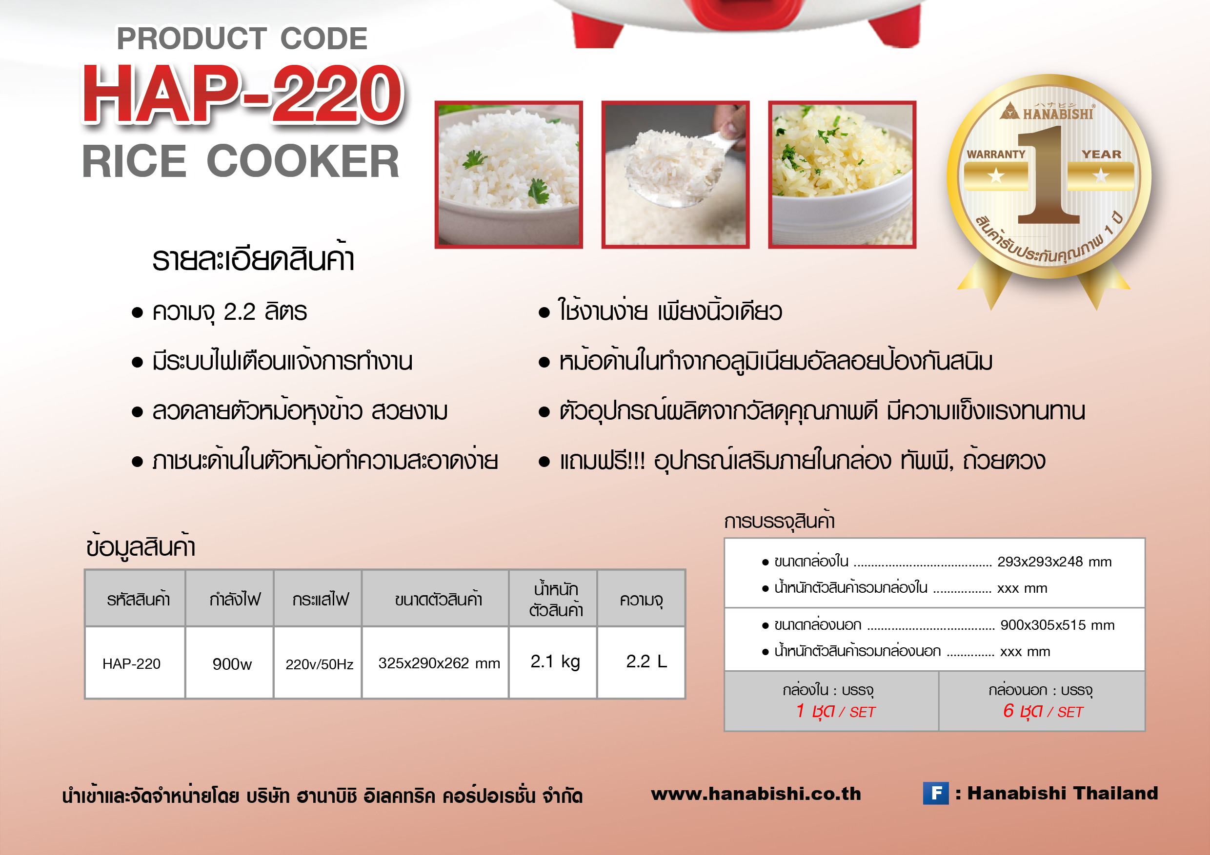 อุปกรณ์เสริมภายในกล่อง : ทัพพีตักข้าว,ถ้วยตวงข้าว,ใบรับประกัน,คู่มือการใช้งาน